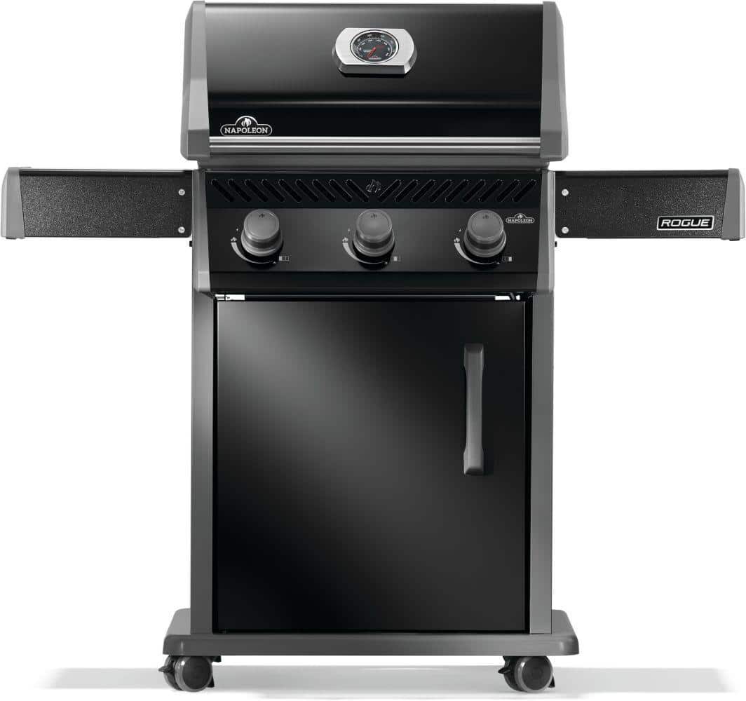 Napoleon’s Rogue® 425 Propane Gas Grill is a premium, yet affordable BBQ marvel. With three burners that light instantly and effortless temperature control, it ensures perfect grilling or roasting. Its cast iron cooking grids deliver even heating and exquisite sear marks, while stainless steel sear plates help reduce flareups. Durable black porcelain enamel and powder-coated surfaces resist weather and fingerprints. Foldable side shelves enhance storage versatility. Ignite instantly with battery-free ignition. Move effortlessly with Locking Caster Wheels. Enjoy exceptional grilling in any space.